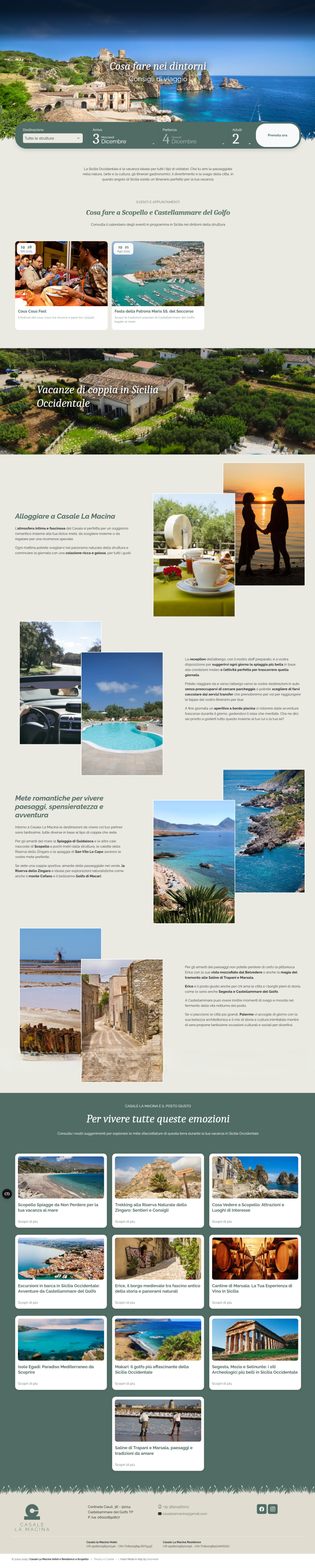 Casale La Macina è una struttura ricettiva di charme posizionata nell'incantevole territorio di Scopello, in Sicilia. L'obiettivo del nuovo progetto digitale è quello di dare agli utenti una rappresentazione realistica dell'esperienza che potrebbero vivere in hotel, mettendo in risalto i suoi punti di forza: ampi spazi di verde curato, piscina esterna e ambiete rilassante, posizione privilegiata, varietà e qualità dei servizi di ospitalità e ristorazione.